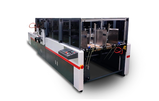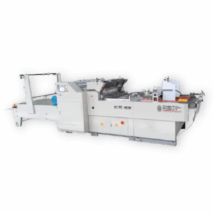 La máquina consiste del alimentador, transportador, sección de encolado, zona de pegado, entrega y sección eléctrica.
